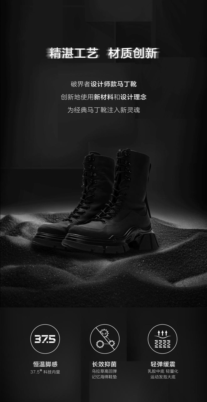 用创新思维去突破常规,不局限于现有的规则桎梏,敢于挑战边界、突破束缚、追求极致、探索未知。红蜻蜓“破界者”马丁靴的设计理念便来源于此。