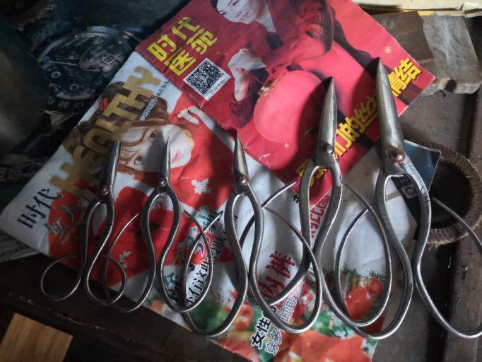 图 4 霍童剪刀。剪刀按照尺寸可分为大、中、小、超小、茶叶剪刀5种,当前的价格(2021年5月)分别是120,118,115,115,115元(剪刀价格随原料、劳动力成本变化)(2021年5月30日张巧坭摄于霍童镇)