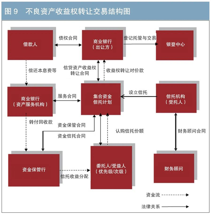 (1)信托机构作为受托人,发起不良资产收益权集合资金信托计划,信托份额全部向合格机构投资者募集并签署《信托合同》,合同约定信托资金用于受让商业银行不良资产收益权(见图9);