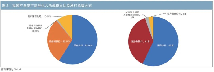 已经发行不良资产证券化产品的发起机构共有22家,其中19家为商业银行,3家为资产管理公司,国有大行不良资产证券化发行规模及单数在不良资产证券化中占比较大(见图3)。