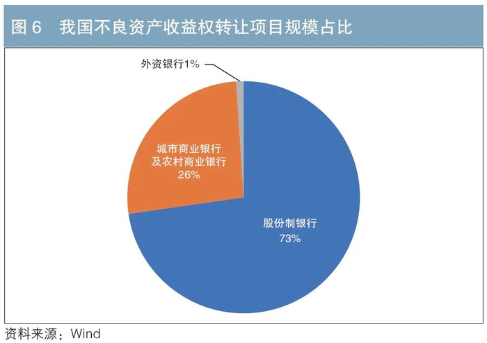 虽然不良资产收益权转让项目规模及数量相对不良资产证券化较小,但从机构数量和类型上看,不良资产收益权转让参与机构数量更多,也更多样化。已发行不良资产收益权转让项目的机构共有25家,其中股份制银行转让规模占比较大(见图6),但城市商业银行和农村商业银行合计为18家,发行单数为22单。