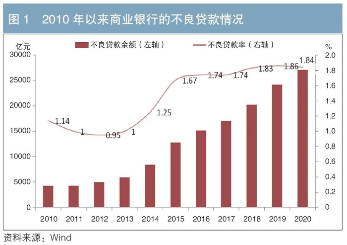 商业银行不良资产一般是指商业银行发放的信贷资产出现不能正常收回或已收不回的贷款。商业银行通常对其发放的贷款进行分级管理,即正常、关注、次级、可疑、损失五类,其中后三类为商业银行的不良资产。近年来,我国经济增速逐步放缓,国内生产总值(GDP)增长率趋于下降,宏观经济逐渐进入周期性底部。尤其新冠肺炎疫情对国内外经济环境产生了巨大冲击。在此背景下,我国商业银行不良贷款总额持续增长,不良率攀升,商业银行面临严峻考验(见图1)。