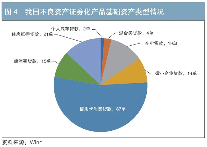 从不良资产证券化资产类型来看,发行数量最多的是个人消费贷款(含一般消费贷款、信用卡消费贷款),共有102单产品(见图4)。