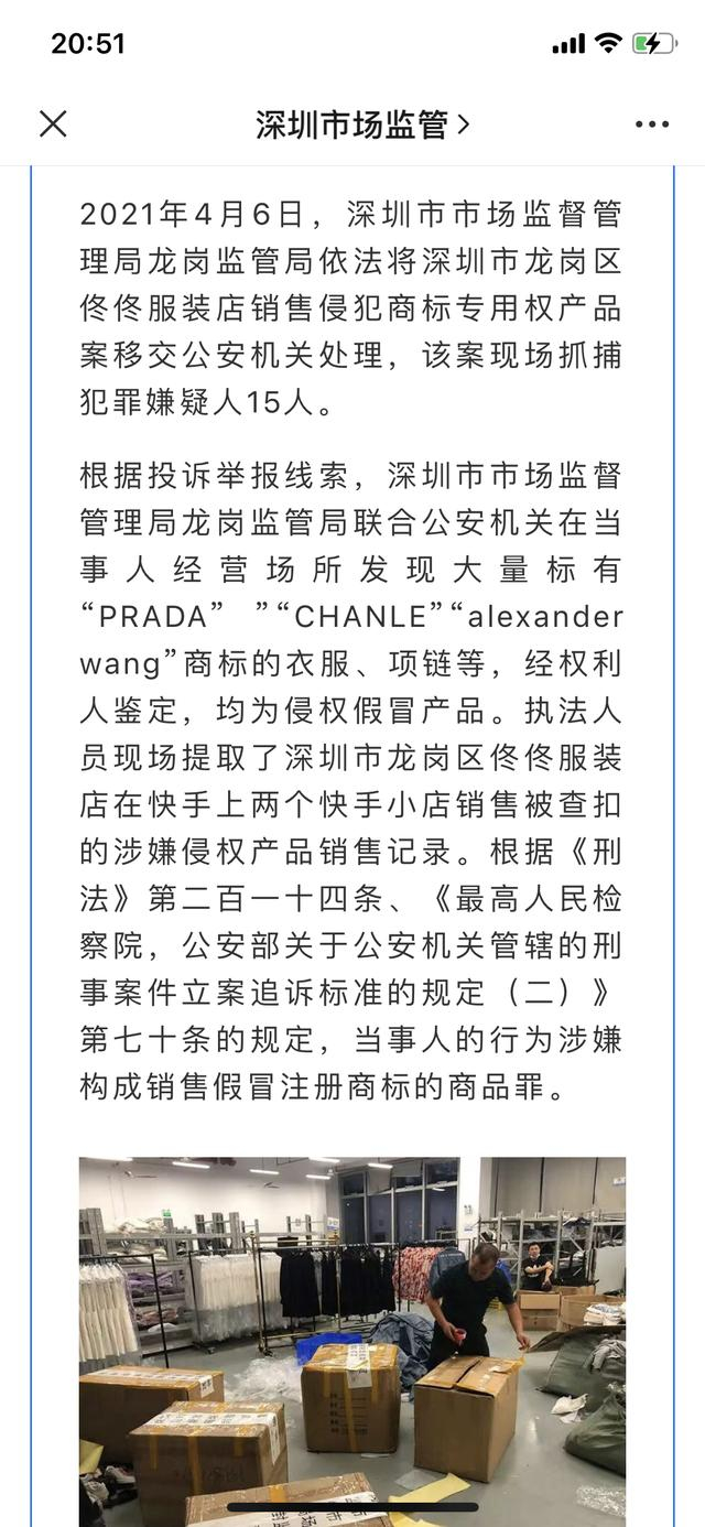 有人举报其涉嫌生产、销售假冒的奢侈商品后,佟佟服装店被相关部门查处。据深圳市市场监督管理局官方微信公众号“深圳市场监管”10月19日的通报,2021年4月6日,深圳市市场监督管理局龙岗监管局依法将佟佟服装店销售侵犯商标专用权产品案移交公安机关处理,其涉案货值高达上百万元,已达到涉刑标准,公安机关现场抓捕犯罪嫌疑人15人。