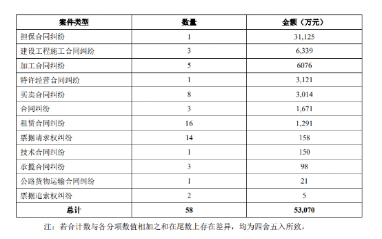 截至目前,公司累计涉及未审结/未调解诉讼案件 58 起,未决诉讼案件涉案金额约为 5.3 亿元。其中数量较多的是租赁合同纠纷和票据请求权纠纷,分别有16起、14起。金额最大的为担保合同纠纷,涉案金额高达3.11亿元。