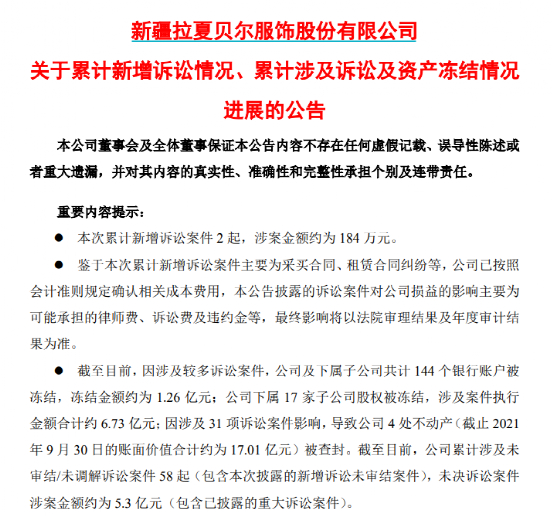 对此,拉夏贝尔在公告中表示,涉及诉讼及资产冻结事项总体对公司资金周转及经营管理造成了一定的影响,目前尚不排除后续或有公司其他资产被冻结的情形。且因公司累计涉及诉讼金额较高,可能会导致公司融资能力下降,加剧公司的资金紧张状况。