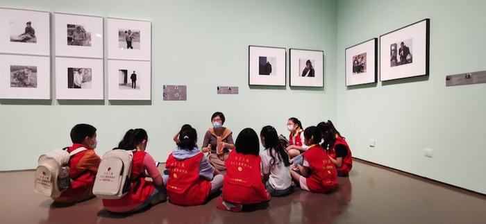 作者系中华艺术宫(上海美术馆)收藏保管部、《在希望的田野上——馆藏逄小威中国农民肖像主题摄影作品展》策展人金懿诺,展览将在中华艺术宫展出至10月30日。 策展人金懿诺给孩子们做导览