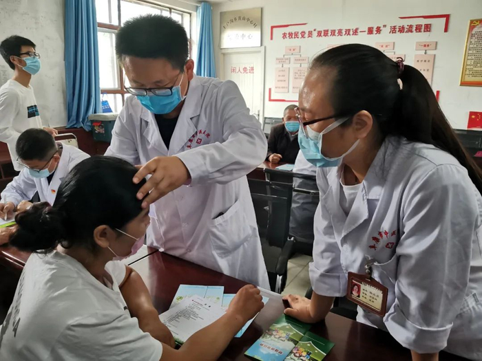 马红青(右二)在阜康市大黄山村参加巡诊义诊活动,为当地百姓诊疗