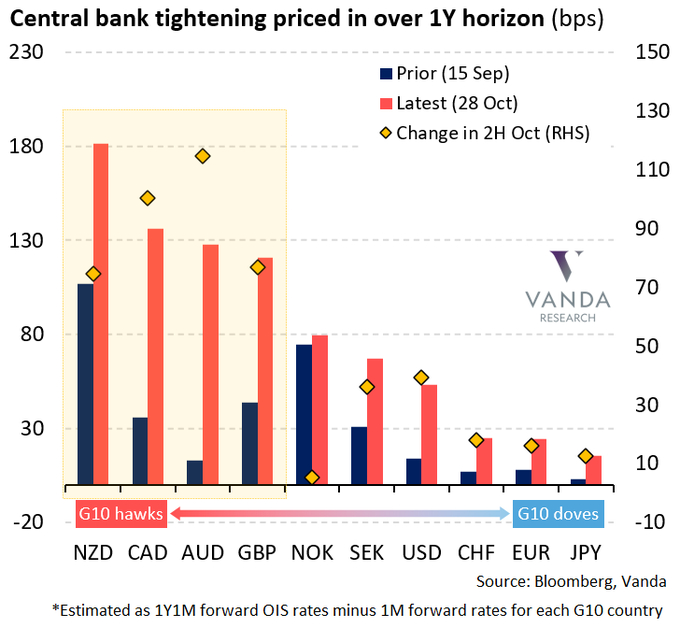一项统计显示,仅在过去两周,利率市场就已经消化了G10央行未来一年将额外加息500个基点的押注。而它们中的很多央行,其实本来完全无意在明年加息。