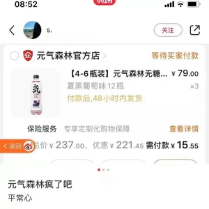 据报道,元气森林近日一淘宝店铺因优惠设置错误,原价79元一箱(12瓶)的气泡水,其购买3箱,最终付款一共花费了10.55元,平均每箱约3.5元。错误的价格导致该款气泡水销量暴增30万单。