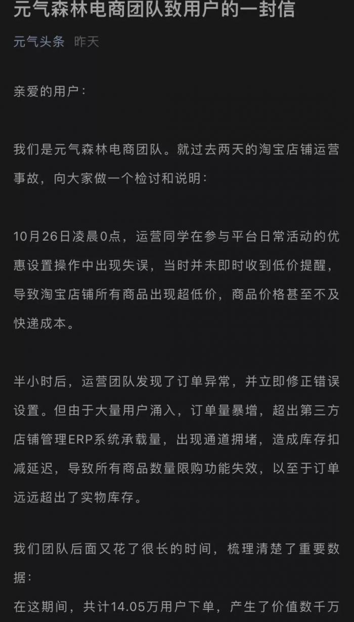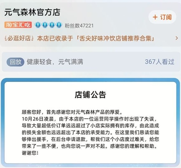 对此,涉事的淘宝元气森林官方店发布公告称:10月26日凌晨,由于本店的一位运营同学操作时出现了失误。希望下单的消费者能够伸出援手,在后台申请退款,帮助小店度过难关。