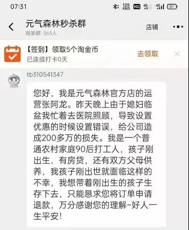 此前,网络中流传的一张淘宝“元气森林秒杀群”的截图显示,有客服以元气森林官方店运营的身份,解释称“由于媳妇临盆忙着去医院照顾,导致设置优惠时设置错误,给公司造成200多万的损失”,并表示自己是“普通农村家庭90后打工人”,恳请消费者将订单申请退款。