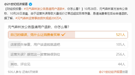 据21世纪经济报道发起的#元气森林发公告恳请用户退款#话题投票,对元气森林被薅羊毛投票数最多的观点为“自己的错误,凭什么让消费者买单”。