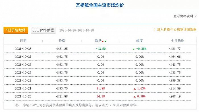 瓦楞纸,作为生产纸板、纸箱的重要包装原材料,也是近期涨价迅猛的品种。截至10月28日,瓦楞纸全国主流市场均价为4481.77元/吨,较去年同期上涨超过30%,价格已达到年内最高点。