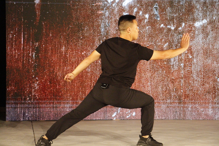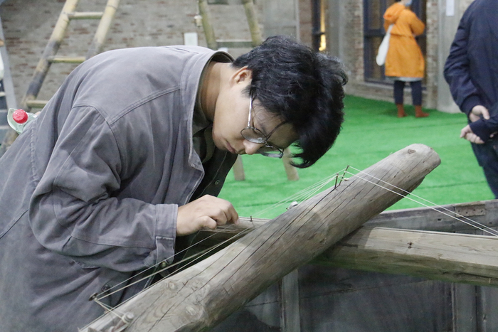 在粮仓文化街区沿溪的一个方仓内,纤维艺术家石冰和林仪从有关“蚕丝”的线索出发,构建出一个与练市的丝业相关的“余音”空间。夜幕降临时,剧场工作者子涵与练市小学船拳教练雷仲孝、练市小学四年级学生沈钟洋共同呈现了一场名为《练福》的演出,展现了练市上百年的船拳文化。