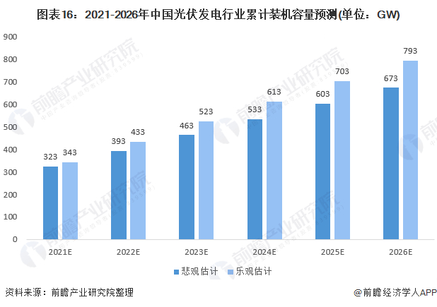 在政策推动和光伏发电成本下降的利好之下,光伏装机容量将持续攀升。根据中国光伏行业协会的预测,在“十四五”期间,我国光伏年均新增光伏装机或将在70-90GW之间,为达成2030年碳达峰,2060年前实现碳中和,光伏行业将成为长期处于高速发展的新能源行业之一,据此预测2026年我国光伏发电行业累计装机量可能在673-793GW之间。