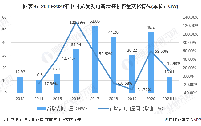 据国家能源局统计数据显示,2017年,我国光伏发电新增装机容量为53.06GW,创历史新高,2018年,受光伏531新政影响,各地光伏发电新增项目有所下滑,全年新增装机容量为44.26GW,同比下降16.58%。受国家光伏行业补贴、金融扶持等政策影响,2020年光伏装机量大幅回升。2021年上半年,全国光伏发电新增装机13.01GW,同比增长12.93%。