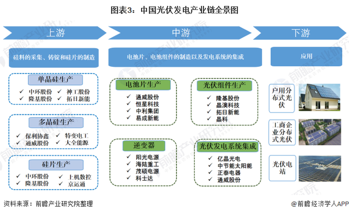 光伏发电的产业链主要有上游主要为光伏电池相关原材料组成,包括形成电池的单晶硅和多晶硅;中游主要为电池片、电池组件生产企业和系统集成企业;下游为光伏发电应用领域,包括分布式光伏发电和集中式电站。