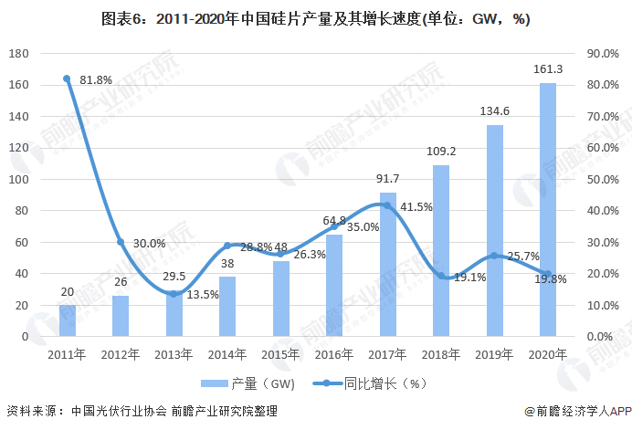 在硅片产量方面,我国更是占有绝对优势,国内产量占全球产量的90%以上。硅片环节产业规模化效应强、产业集中度高,前十家硅片企业产量占比60%以上。2020年,国内硅片产量为161.3GW,同比增长19.8%。