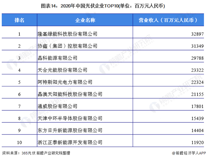 由365光伏统计的2020年中国光伏企业10强榜单已出炉。其中,隆基绿能科技股份有限公司排名第一,2019年营业收入达到328.97亿元。此外,协鑫(集团)控股有限公司、晶科能源有限公司、天合光能股份有限公司、阿特斯阳光电力有限公司分列第二、第三、第四、第五位。