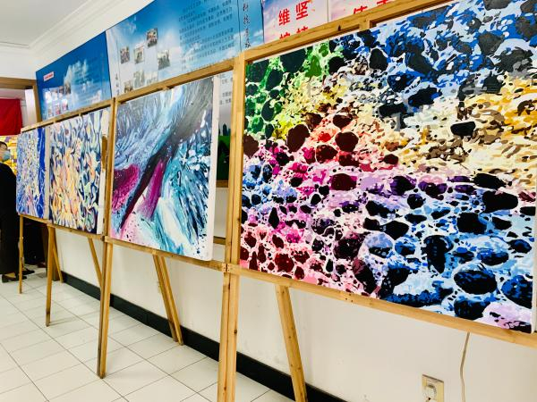 美术展分成两部分,在“模拟实际物体”板块,学生通过在放大镜下观察,从人们从未见过的视角来描绘生活中的常见之物。海星、贝壳、丝瓜瓤……贴近生活的作品让居民感受到美术创作离自己如此相近。而在“包豪斯设计百年”板块,学生们致敬包豪斯设计、在传统空间装饰中融入学院派理解的作品,又让居民开阔了眼界。