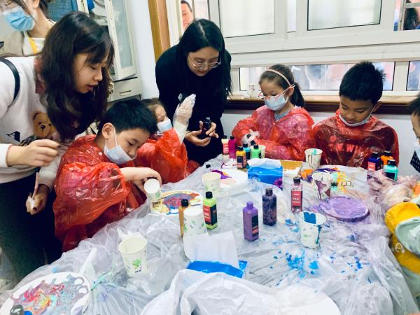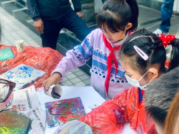 “美术馆”内,一个流体画创作课堂正在进行,小朋友和城规学院景观学系的学生们一起埋头在斑斓的色彩中。流体画,是用一种互不相融的颜料,混合后倒在油画板上,即兴碰撞出色彩和图案,作品具有独特的偶然性。