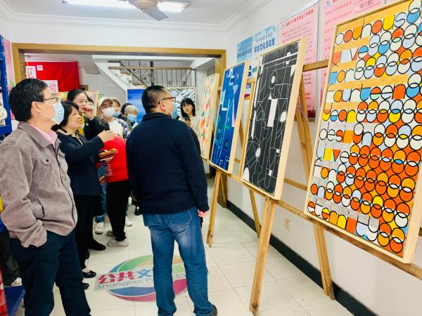这是一个开在小区居委会活动室里的微型“美术馆”,作品来自同济大学建筑与城规学院的学生。10月30日一早,由四平路街道与同济大学建筑与城市规划学院研究生联合举办的“美育进社区”系列活动在杨浦区同济绿园小区开展。