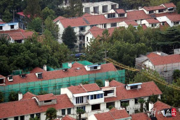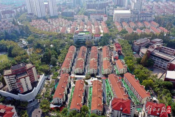 俯瞰曹杨新村,成排连片的房屋,砖红色的屋顶,成为靓丽一景。
