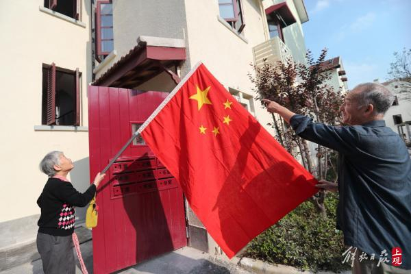 1952年高阿姨搬来时恰逢十一国庆,每栋楼门口都挂起鲜艳的五星红旗,居民们敲锣打鼓庆祝国庆,欢迎新邻居。现在,唐新华、高林林夫妇又拿出珍藏的国旗,让五星红旗见证曹杨居民的幸福时刻。