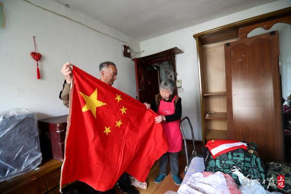 1952年高林林搬来时恰逢十一国庆,每栋楼门口都挂起鲜艳的五星红旗,居民们敲锣打鼓庆祝国庆,欢迎新邻居。现在,唐新华、高林林夫妇又拿出珍藏的国旗,让五星红旗见证曹杨居民的幸福时刻。