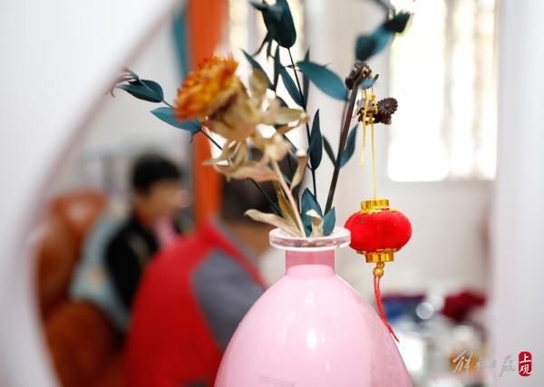 毛耀昌家的玄关上放置的小饰品,一顶红灯笼充满喜庆。