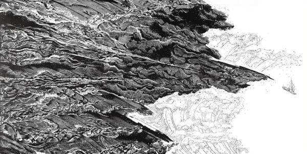 作品《江海余生》(黑白木刻,代大权2019年创作)是一幅动人心魄的作品。画面上,巨大波涛滚滚而来,一条小船成功突围出来,驶向平静的顺流。作品采用强烈的黑、白、灰对比,黑和灰占据了画面的大部分,小船被挤压到边缘,但它坚强地承受住并冲出了黑和灰,进入象征顺流的白境。技法上采取了传统的角刀、圆刀、排刀的密集的线和点,结合运用了现代艺术语言表达,把江海波涛千回万转、惊天动地的情境淋漓尽致地表现出来。