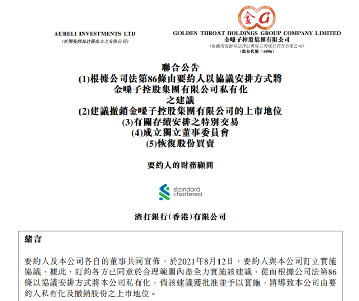 10月29日早上,金嗓子发布公告称,要约人(一间由创办人控股公司及亚赋控股公司间接全资拥有之公司)与本公司,以通过协议安排方式将本公司私有化,将按每股计划股份2.80港元注销股份(较10月28日收市价溢价3.7%)。公司预期将于12月15日上午9时撤销股份在港交所的上市地位。