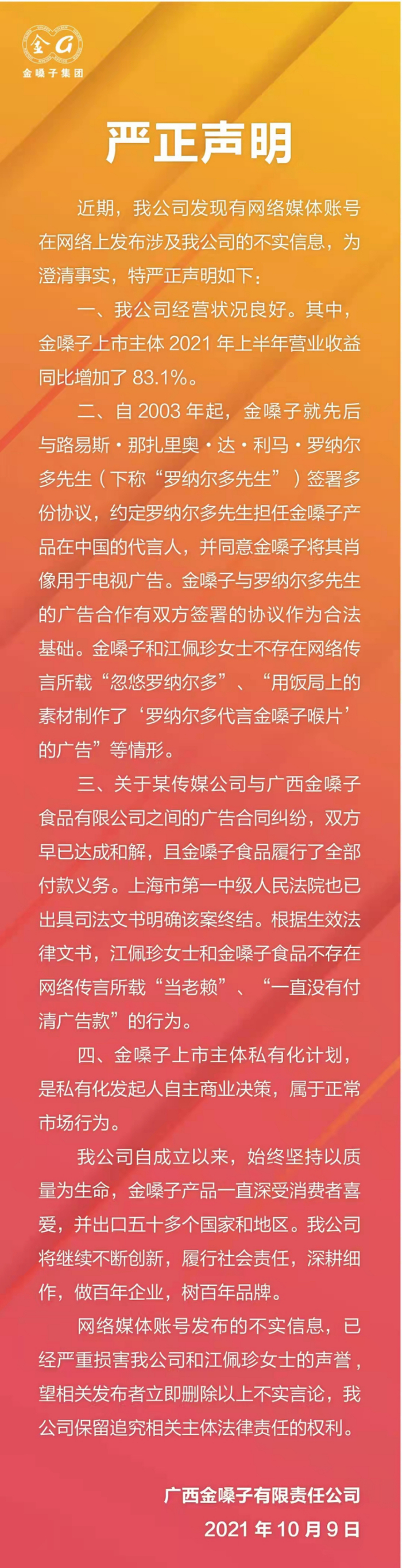 针对上述事件,2021年10月9日,广西金嗓子有限责任公司发布严正声明称,关于某传媒公司与广西金嗓子食品有限公司之间的广告合同纠纷,双方早已达成和解,且金嗓子食品履行了全部付款义务。上海市第一中级人民法院也已出具司法文书明确该案终结。根据生效法律文书,江佩珍女士和金嗓子食品不存在网络传言所载“当老赖”、“一直没有付清广告款”的行为。