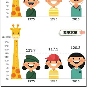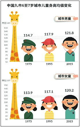卫生部(2013年并入国家卫计委)从1975年起,每十年会发布对北京、哈尔滨、西安、上海、南京、武汉、广州、福州、昆明等9个城市(简称九市)及其郊区7岁以下健康儿童体格发育的调查报告。截取6至7岁城市儿童的身高数据可以发现,在每20年的时间间隔中,男童女童的平均身高增长较为显著;40年间,6至7岁的城市男童和女童身高分别增高了7.1厘米和6.3厘米。