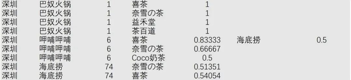 综合上述信息和数据,我们也做了一些统计。在北京,呷哺呷哺和海底捞与周边奶茶店有关联关系。与呷哺呷哺有关联的奶茶店有coco、一点点、本宫的茶 ,而海底捞和Coco奶茶更容易同时出现。