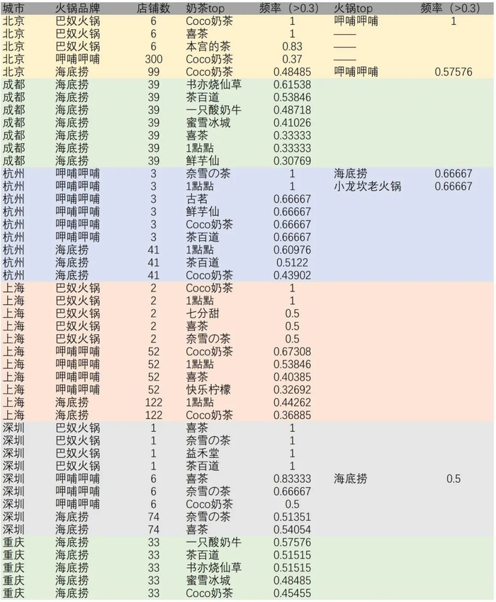 那我们取0.5作为中间值来看,只有特定城市,少数火锅品牌与奶茶品牌形成了相关性。比如,在北京,乐乐茶附近有非常大概率会有一家巴奴火锅店,在成都,海底捞旁边很可能会有茶百道。