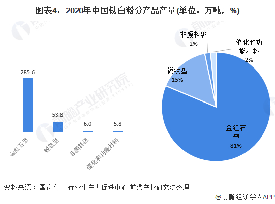 从2020年钛白粉细分产品产量占比来看,在351万吨总产量中,金红石型钛白粉为285.6万吨,占比为81.31%;锐钛型钛白粉为53.8万吨,占比为15.33%;非颜料级钛白粉为6.0万吨,占比为1.71%;催化和功能材料钛白粉为5.8万吨,占比为1.65%。