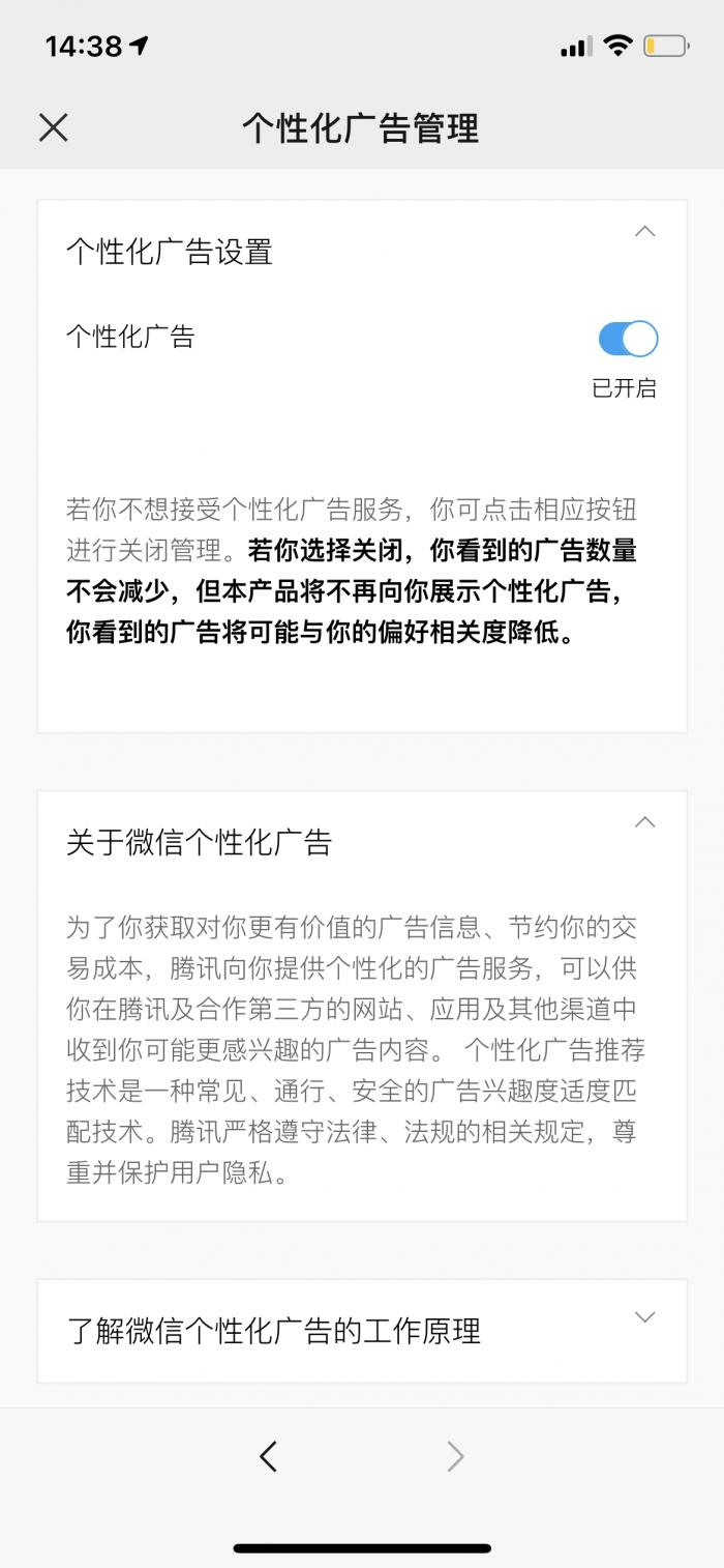 此次iOS版本的微信 v8.0.16版本中,单设了个性化广告管理,用户可选择关闭“个性化广告”。若选择关闭,用户看到的广告数量不会减少,但将不再推送个性化广告,与用户偏好相关度降低。