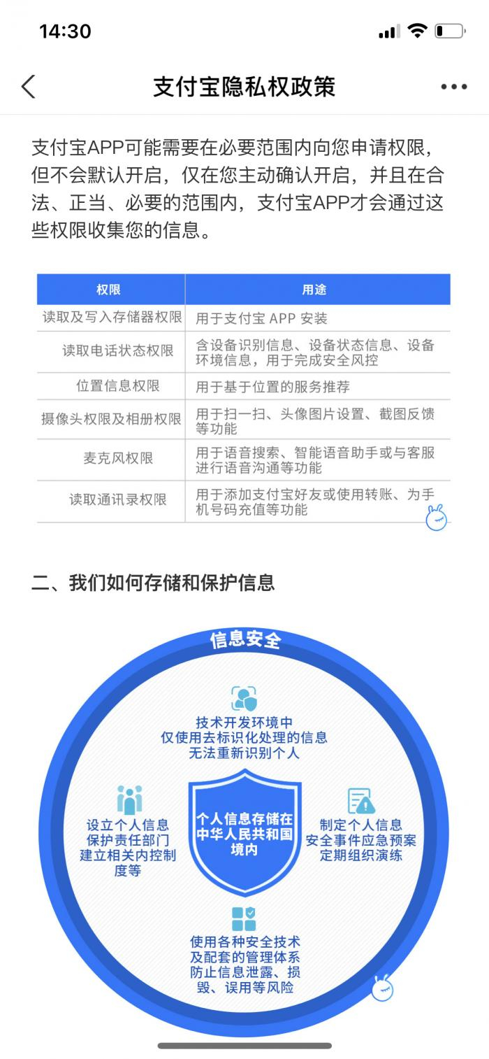 支付宝已更新其隐私权政策对此作了改良,相较于此前冗长详尽的隐私政策,推出了简要版的隐私政策,约1000字,从如何收集信息、如何存储和保护信息、如何对外提供信息、用户如何访问和管理自己的信息四个方面进行了阐述,并结合了视频与图表的形式。同时,支付宝也提供了完整版隐私权政策,用户可点击“支付宝隐私权政策(完整版)”查看。
