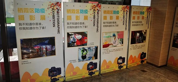 而且在门禁处,展示这栖霞区防疫摄影展,门卫不时提醒来往的业主带好口罩,并为行动不便的业主主动刷通行卡。