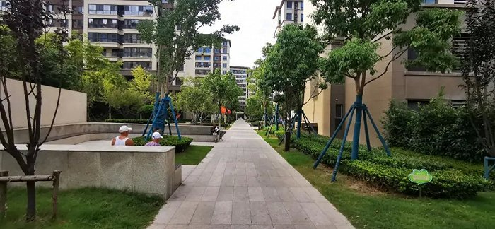 进入小区西门后,便看到了小区的中轴线,两侧种满了银杏、乌桕、樱花等树木植被,在阳光的照射下,在石板路上勾勒出树木的身姿。