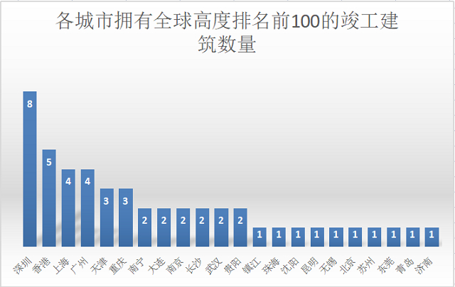 与此同时,第一财经记者根据CTBUH官网公布的“全球最高的100座竣工建筑”数据统计得知,在该榜单中,中国有49座建筑入围。其中,深圳有8座,香港5座,上海和广州各4座,天津和重庆有3座,南宁、大连、南京、长沙、武汉、贵阳分别有2座,北京、镇江、珠海、沈阳、昆明、无锡、苏州、东莞、青岛和济南分别有1座。