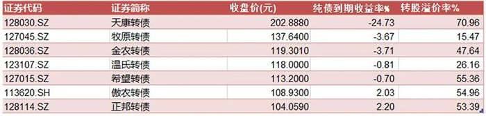 国泰君安固收分析师覃汉在其报告中表示,同属于饲料细分赛道的转债有傲农、正邦和希望转债等,当前转股溢价率大都在50%以上。与生猪养殖相关的转债有牧原、正邦、温氏和希望转债等,由于“猪周期”导致股价下行幅度较大,转股溢价率多维持在高位。而牧原转债由于前期刚刚上市,有较大参考意义。
