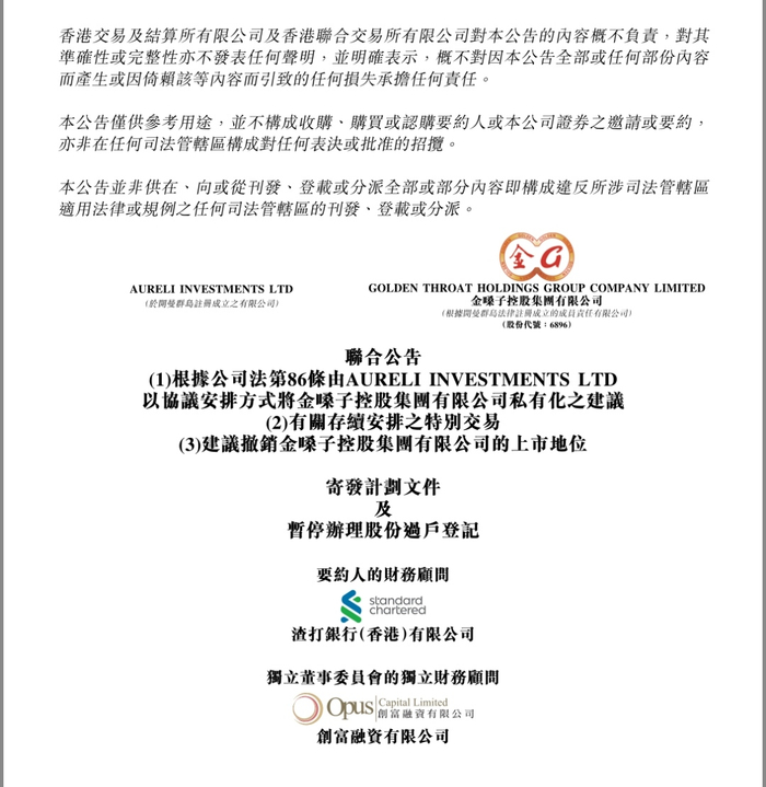 10月29日,金嗓子在港交所发布公告称,要约人(一家由创办人控股公司及亚赋控股公司间接全资拥有之公司)与金嗓子,以通过协议安排方式将公司私有化,将按每股计划股份2.80港元注销股份。公司预期将于12月15日上午9时撤销股份在港交所的上市地位。