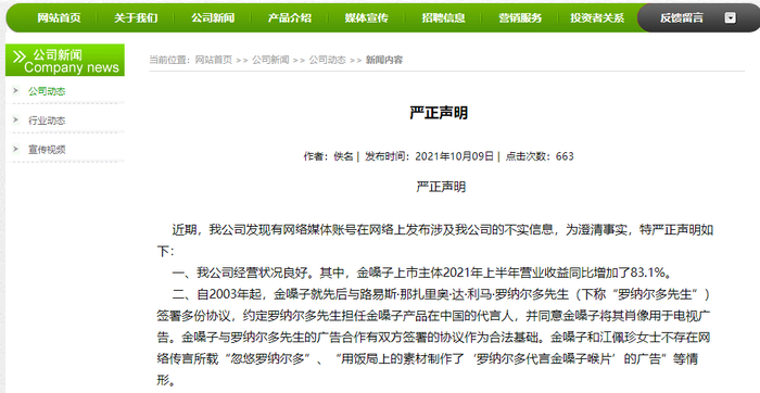 不过后有报道称,金嗓子发布的罗纳尔多代言广告,并未得到球星本人的同意,双方也没有签订任何合同,并为此出现纠纷。对此,前不久金嗓子对此作出回应表示,自2003年起,金嗓子就先后与罗纳尔多签署多份协议,约定罗纳尔多担任金嗓子产品在中国的代言人,并同意金嗓子将其肖像用于电视广告。金嗓子与罗纳尔多的广告合作有双方签署的协议作为合法基础。金嗓子和金嗓子创始人江佩珍不存在网络传言所载“忽悠罗纳尔多”、“用饭局上的素材制作了‘罗纳尔多代言金嗓子喉片’的广告”等情形。