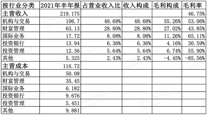表 证券行业对比国泰君安(证券代码:601211.SH)收入成本分析(单位:亿元)