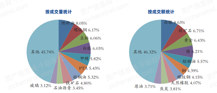2020年,中国商品期货成交量排名前十的品种为:燃料油、螺纹钢、豆粕、白银、甲醇、PTA、棕榈油、铁矿石、石油沥青和玻璃,合计成交量32.17亿手,占商品期货总成交量的54.26%。成交额排名前十的品种为:白银、铁矿石、黄金、镍、棕榈油、铜、螺纹钢、天然橡胶、焦炭和原油,合计成交额172.83万亿元,占商品期货总成交额的53.68%。