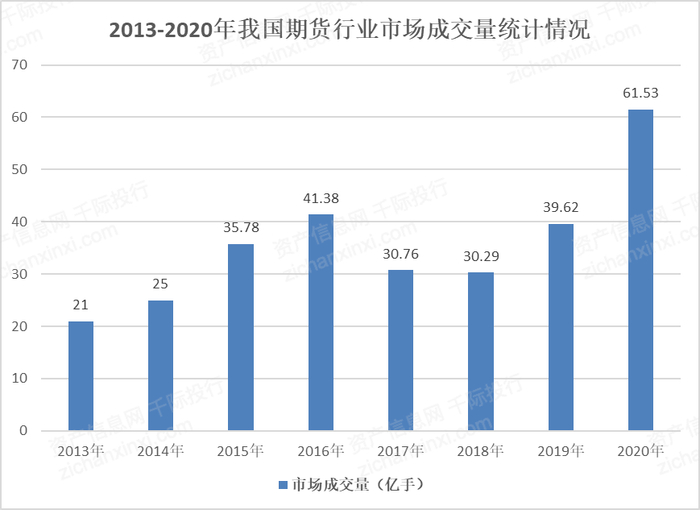 图 2013-2020年我国期货行业市场成交量统计情况
