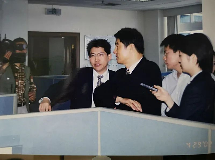 2002年4月,时任新华社社长田聪明视察上海证券报。